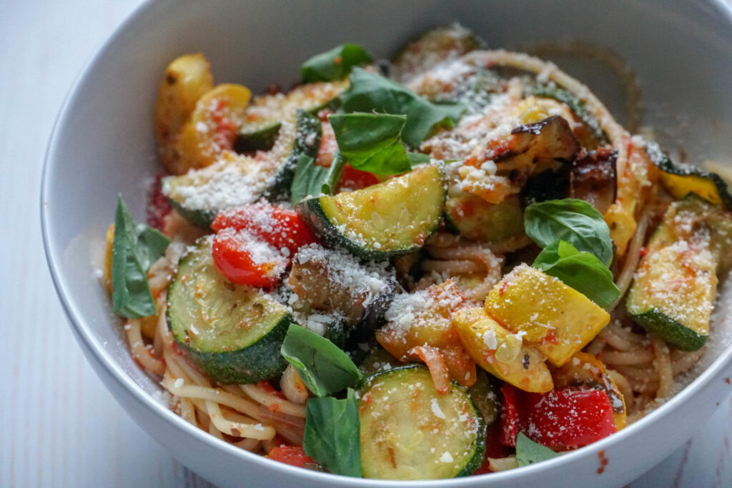 Imagínese las verduras del pisto (calabacín, calabaza de verano, tomates y berenjenas) pero cocinadas rápidamente en una plancha, mezcladas con espaguetis y albahaca y luego espolvoreadas con queso. Así es este delicioso plato que sabe a verano en un bol.